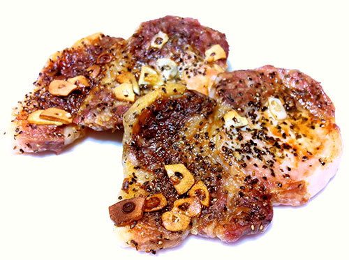 3. 岩塩と黒こしょうを全体にふり、オリーブオイルをかけて、スライスしたにんにくをのせて、網の上にのせます。