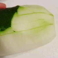 皮の近くは固い緑のスジが通っているので、皮は厚めに剥きます・・・と、今回のレシピに書きましたが、そうしなければ食べられないわけではありません。 今回のように、生で食べる時や、とろりんとした食感に仕上げたい煮物の時には厚く剥いた方が良いですが、油通しして炒め物に使うなど、カタチが崩れにくい方が良い時は薄く剥くのも良いです。皮の近くには栄養分も多いので、調理内容に合わせて剥く皮の厚みを変えてみてくださいね。