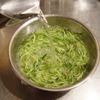一度に透明になるまで茹でてしまって、タッパーにゆで汁ごと入れて冷蔵庫で保管しておけば、汁物や煮物の具として便利です。 |
