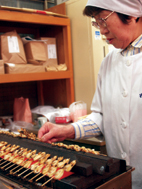 またまた、こうばしい香り・・・その香りの出所を探る。中をのぞくとあさりを串に刺し、昔から変わらない手焼きで焼く「焼きあさり」が焼かれていた。
