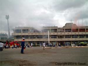 2003年9月7日に「浦安市防災訓練」が入船北小学校で行われました。 浦安市内の自治会から数多くの方が参加しました。 掲示板でも別な意味で話題になっていましたが、 ヘリコプターまで来るかなり本格的な防災訓練でした。