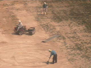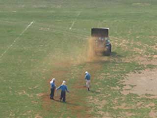 2004年6月24日朝から明海球技場には何台ものダンプカーで、土が運び込まれました。今年2度目の土入れは、はげてしまった芝生を再生することができるのでしょうか?