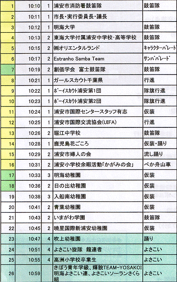 市内の幼稚園、保育園、小学校、中学校、高校、大学、市民サークル、企業など、公募により選ばれた団体が、パレードに参加します。公募団体へは6月8日にパレードの順番などの通知がありました。
