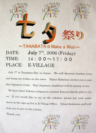 2006年7月7日にE-Villageで、近隣の子供たちを招いて七夕祭りが開催されました。