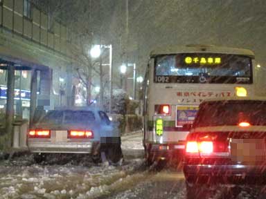 新浦安駅北側ではバス停に立ち往生した乗用車が止まって、バスが道路の真ん中で止まっていました。