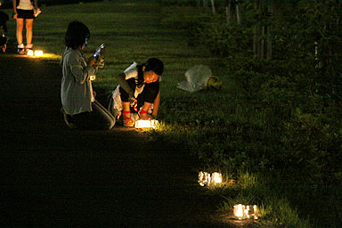 明神橋付近では、エコキャンドルに火をともし、街並みをライトアップしました。