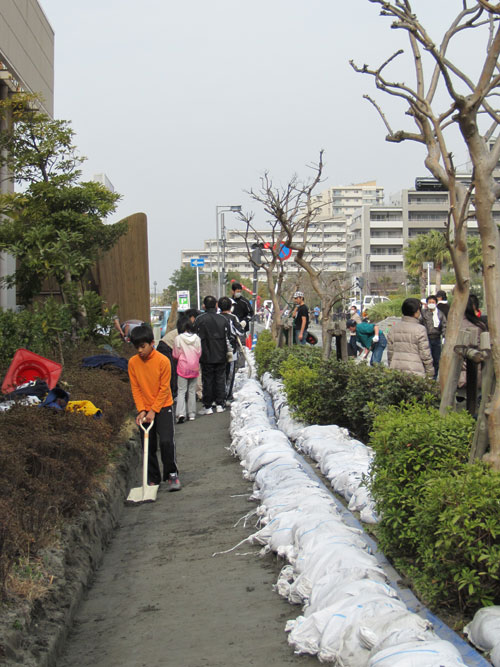 パークシティ新浦安では、マンションからシンボルロードまでの間の下水管が地震の被害を受け使えなくなり、仮設の下水管が歩道に設置されているそうです。このため、泥かきとともに、その仮設の下水管を守るために、土のうを積む作業も行われました。