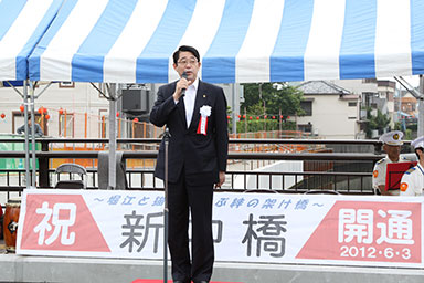 渡り初めでは堀江と猫実両自治会が橋の真ん中で握手