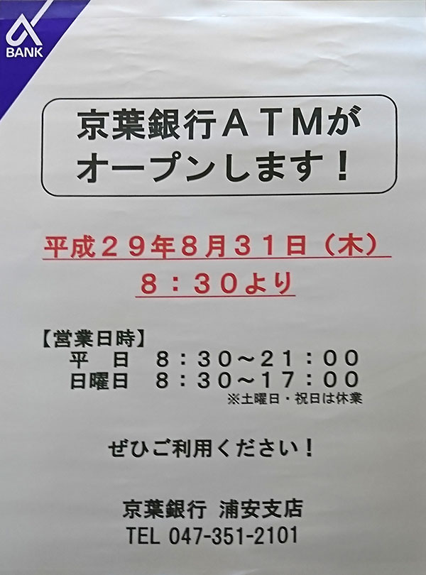 2017年8月31日に市役所1階ロビーに「京葉銀行ATM」がオープンしました。