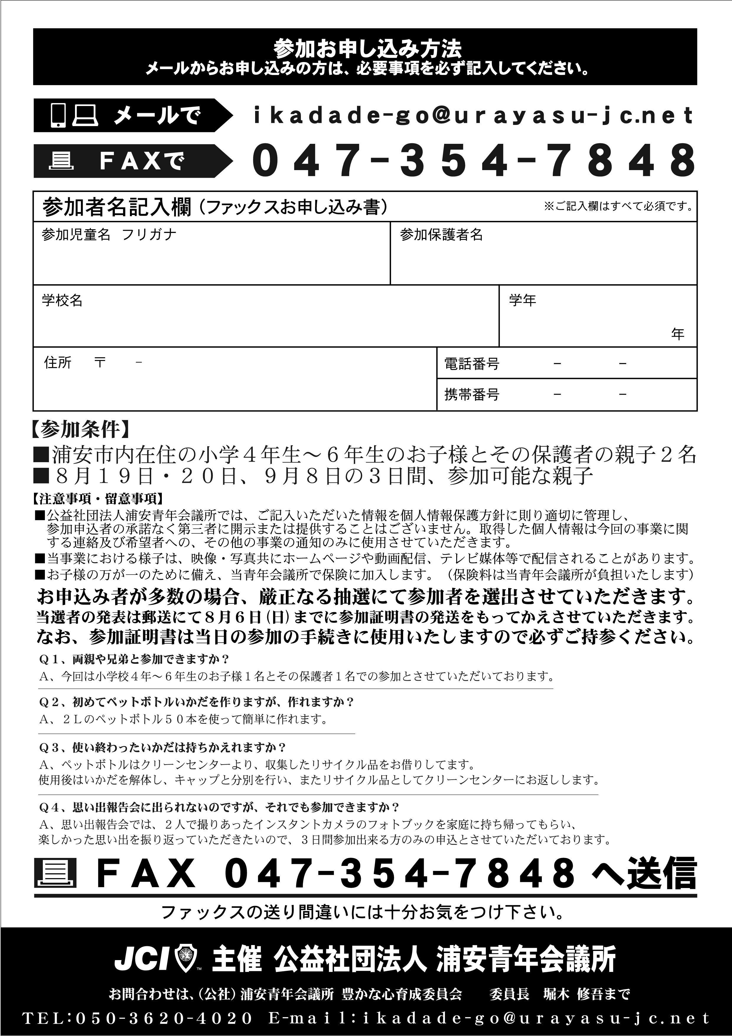 参加対象者 : 浦安市内在住小学校4年生~6年生のお子様1名とその保護者様1名の1組