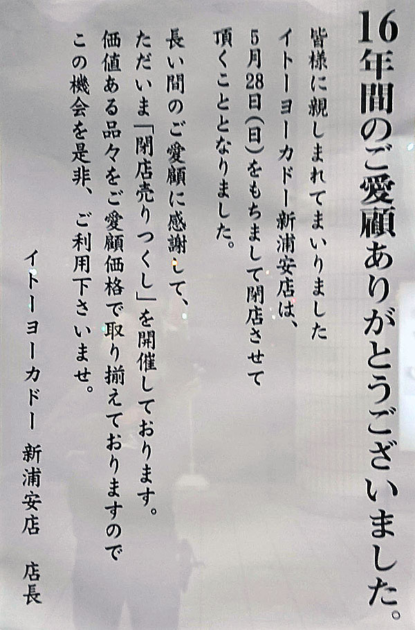 イトーヨーカドー新浦安店は、2007年5月28日(日)に閉店します。