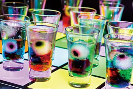 メロンシロップとブルーハワイシロップに炭酸水を加え、ディスコライトをイ メージした赤・緑・青の 3 色のカラフルなゼリーを浮かべました。不気味に浮かぶ目玉のゼリーは、見かけとは裏腹に優しいカルピス味です。