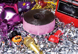 ココア、ダークチョコレート、プレーンの 3 色のシフォンケーキ生地をマーブル模様に焼き上げました。側面は、紫芋のピューレと生クリームを合わ せたクリームで、レコード盤を思わせる真っ黒なトップは、ココアと生クリ ームを合わせたクリームでコーティングした後、溝を描いて仕上げています。 シフォンケーキのふわっとした食感をお楽しみください。