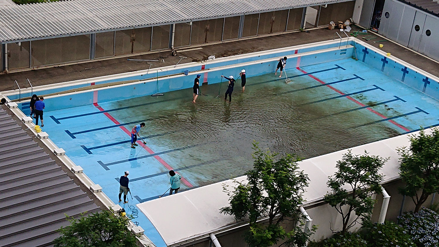 夏に向けて、梅雨の晴れ間に市内の学校ではプールの清掃が行われました。