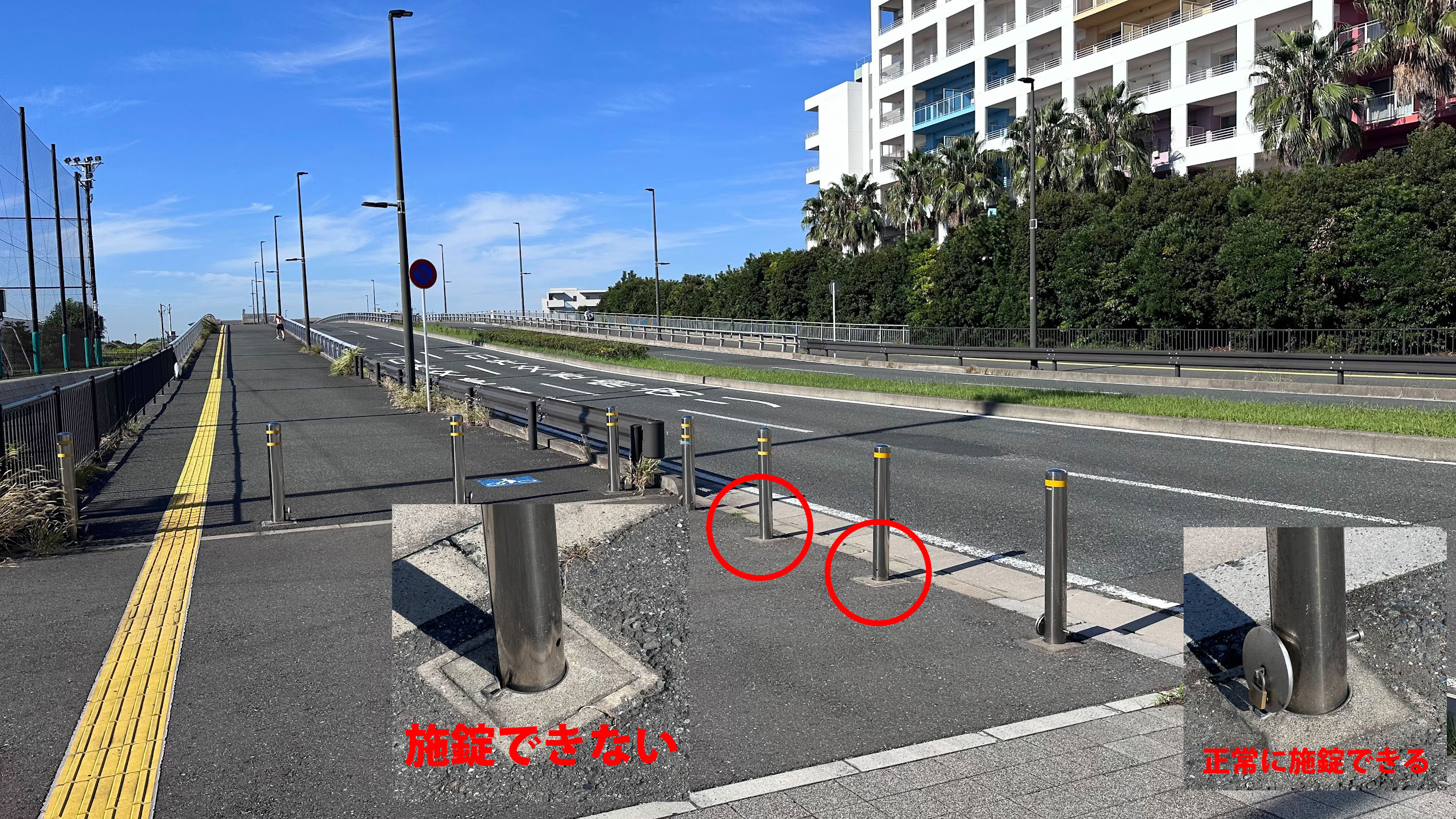 浦安市総合公園周辺の歩道に設置されている「車止めポール」が数カ所消失しています。